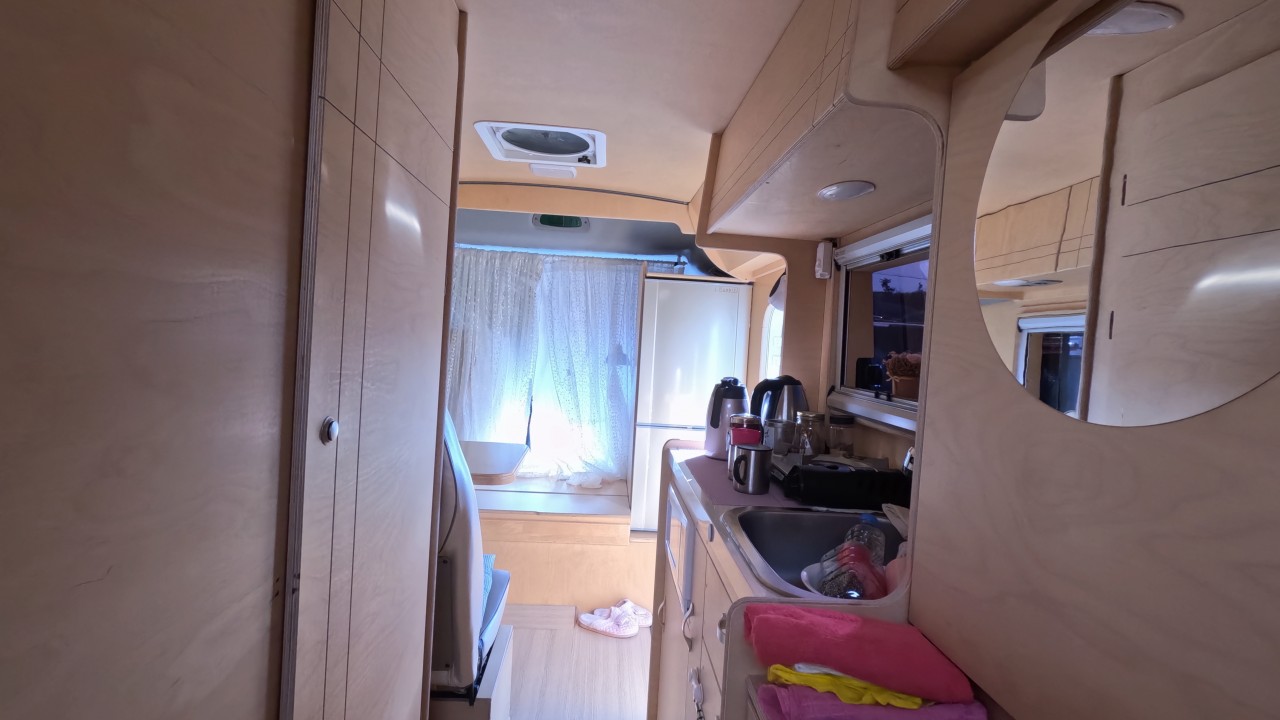 내부 : 벽걸이에어컨, 에바스D2, 온수, TV, 냉장고, 전자렌지, 개수대, 청수150L, 오수100L, 욕실, 고정식변기, 맥스팬, 해키창, 자작나무