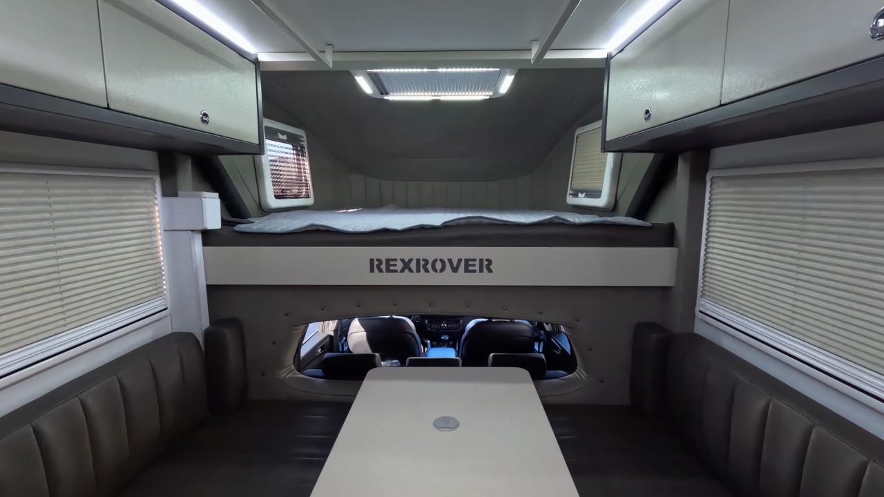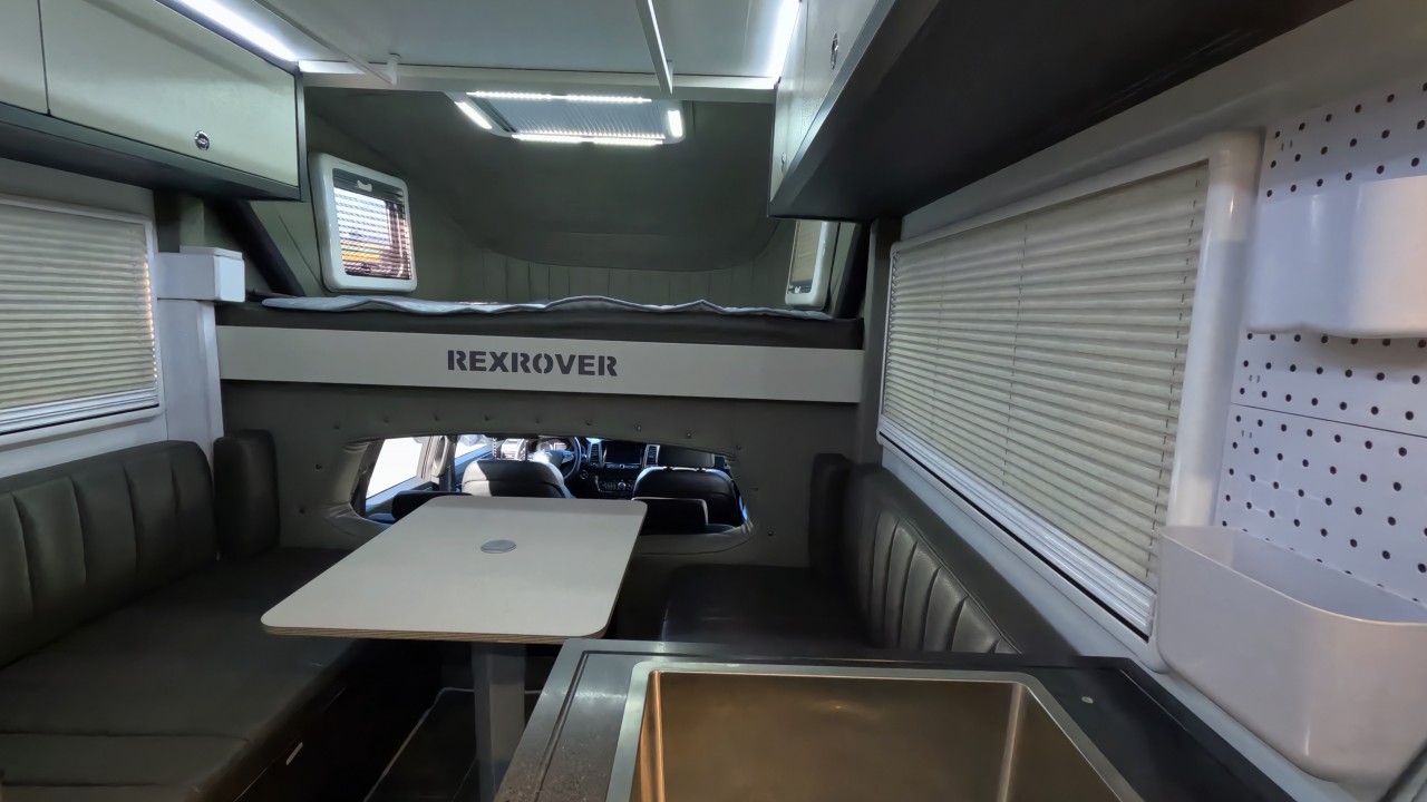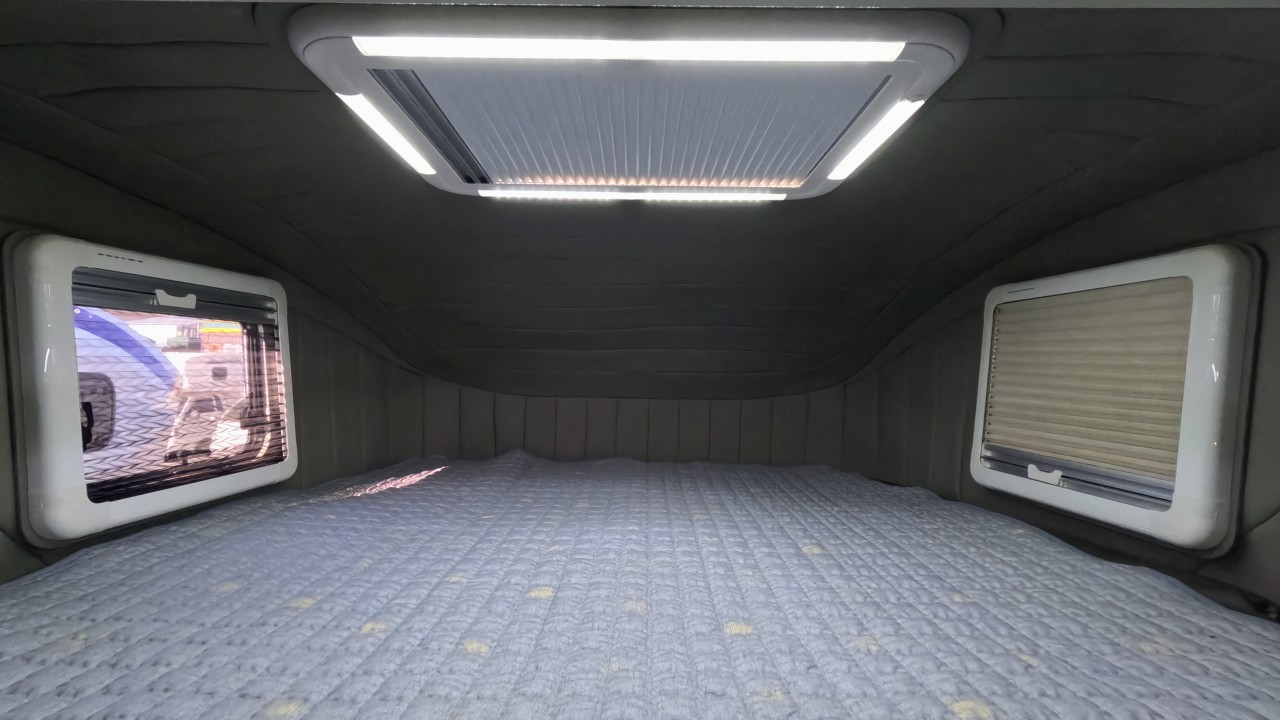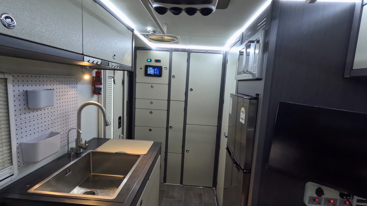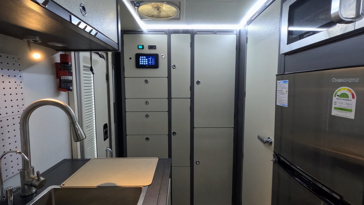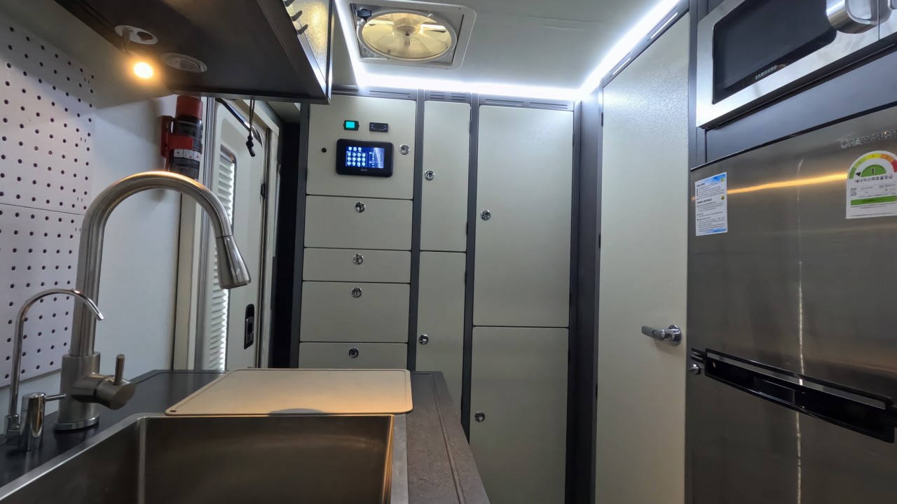 내부 : 천장형에어컨, 무시동히터, 온수, 바닥난방, TV, 냉장고135L, 전자렌지, 개수대, 청수180L, 오수180L, 욕실, 고정식변기