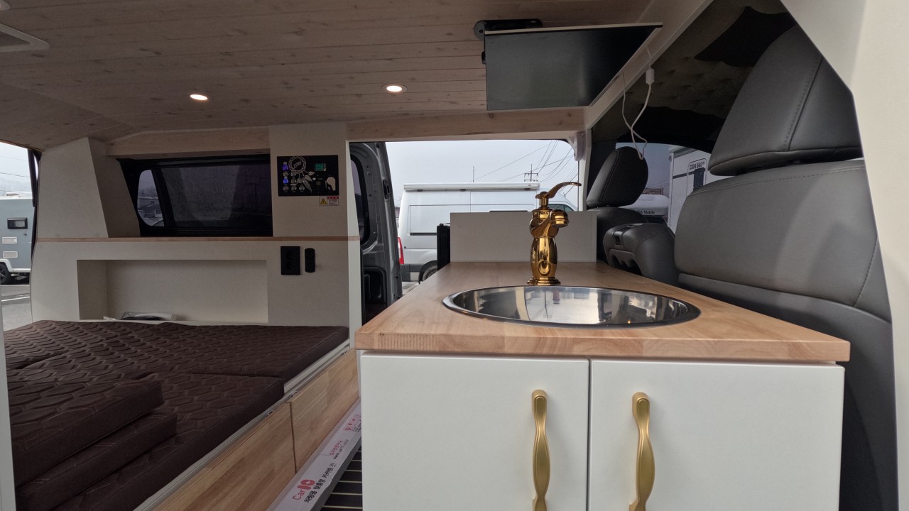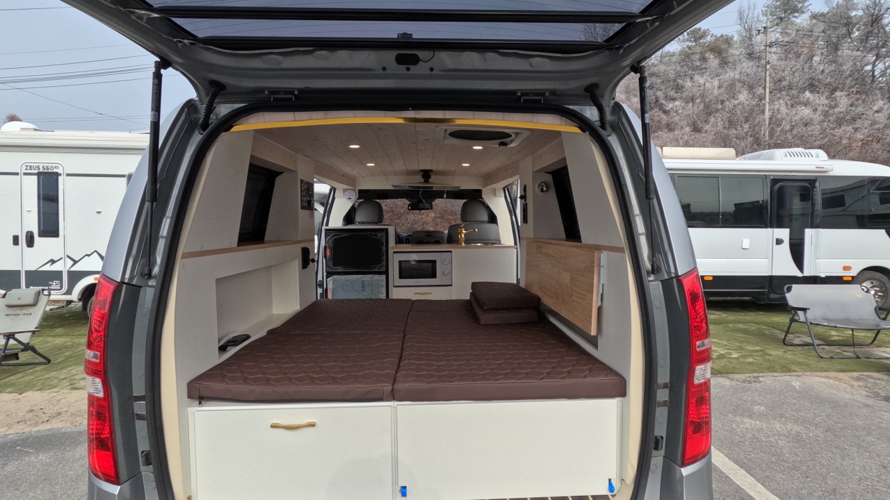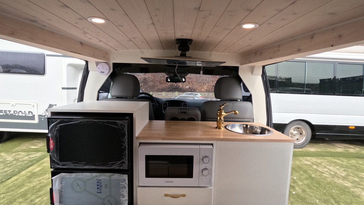 내부 : 에바스D2, TV, 냉장고, 전자렌지, 개수대, 청수20L, 오수20L, 맥스팬, 접이식선반, 하이패스