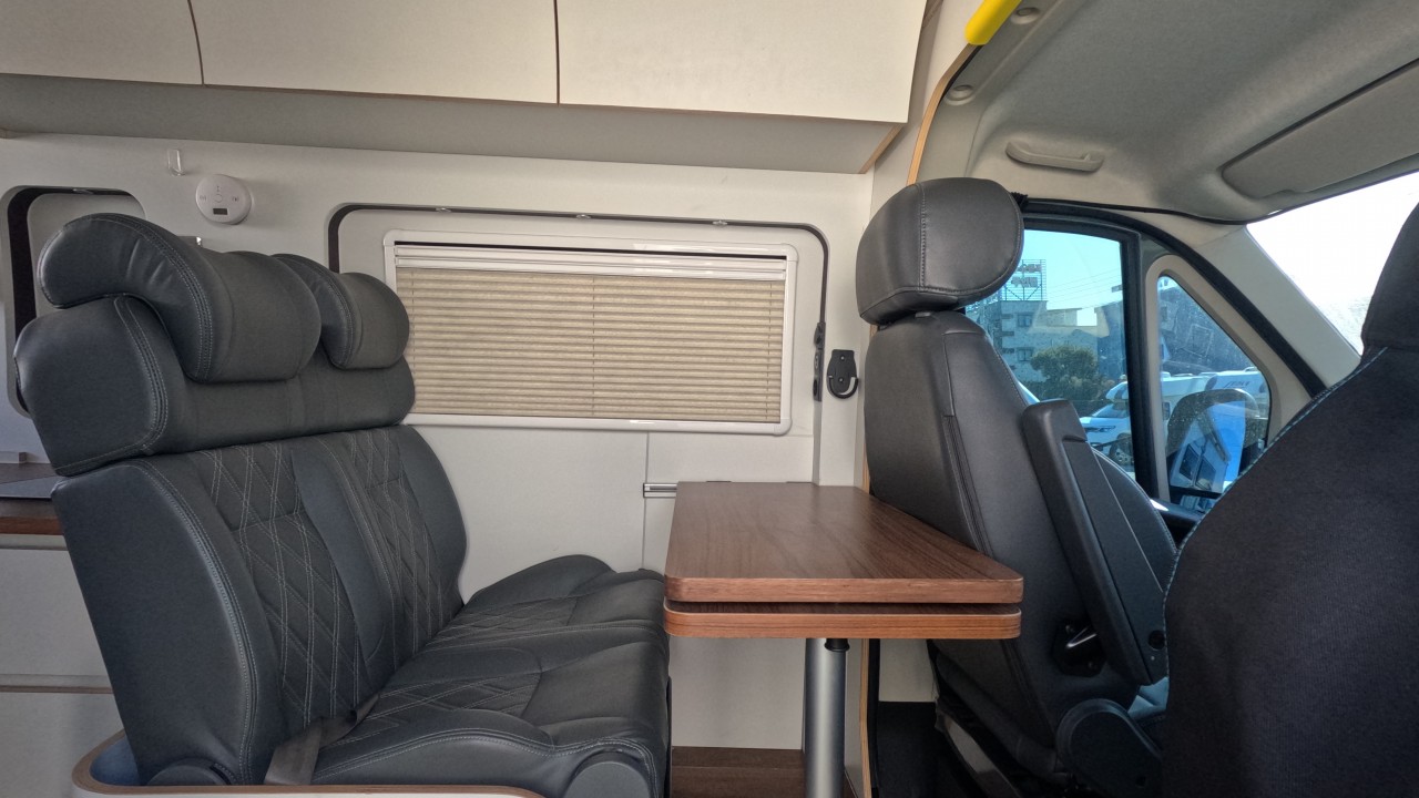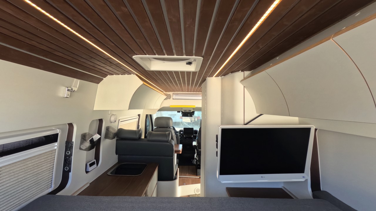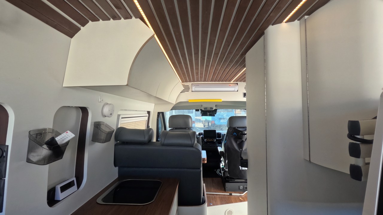 내부 : 바닥형에어컨, 에바스D2, 온수, TV, 냉장고110L, 전자렌지, 개수대, 청수120L, 오수90L, 욕실, 고정식변기, 전면커튼,