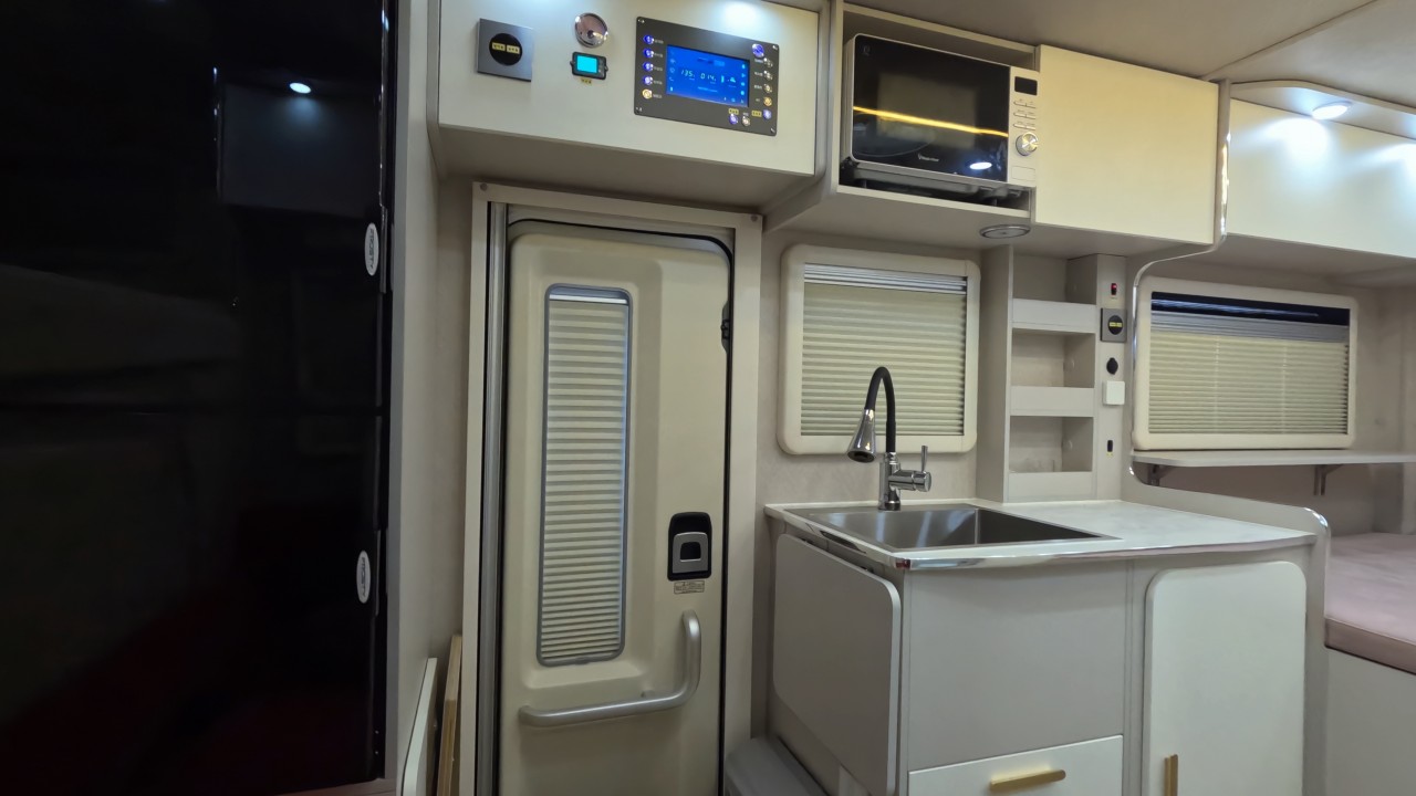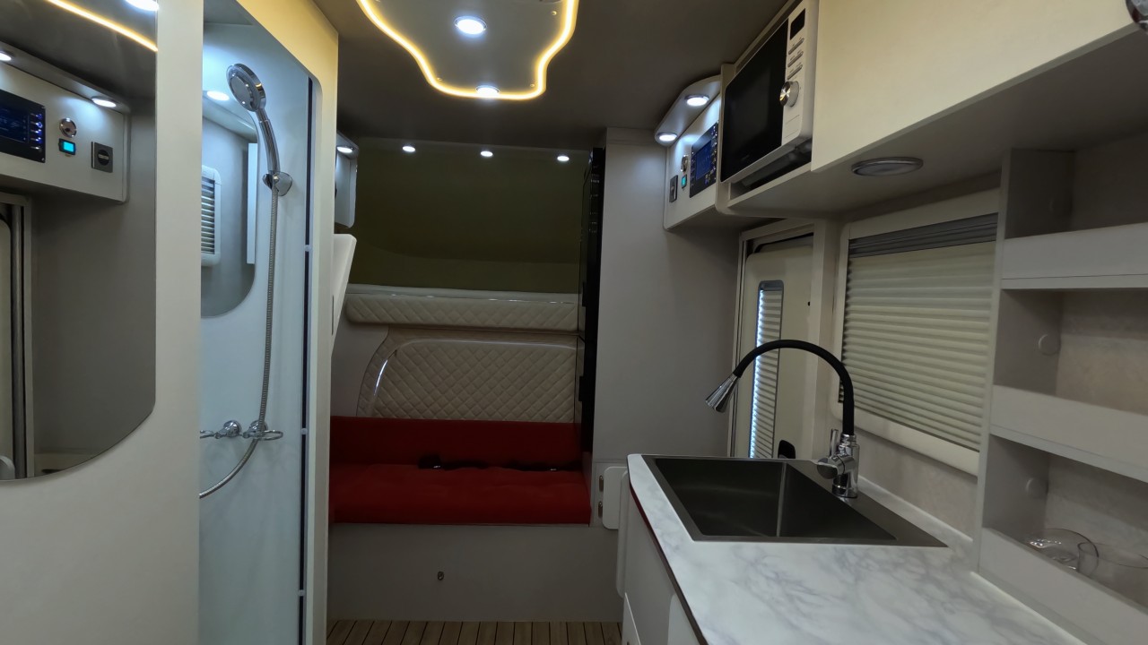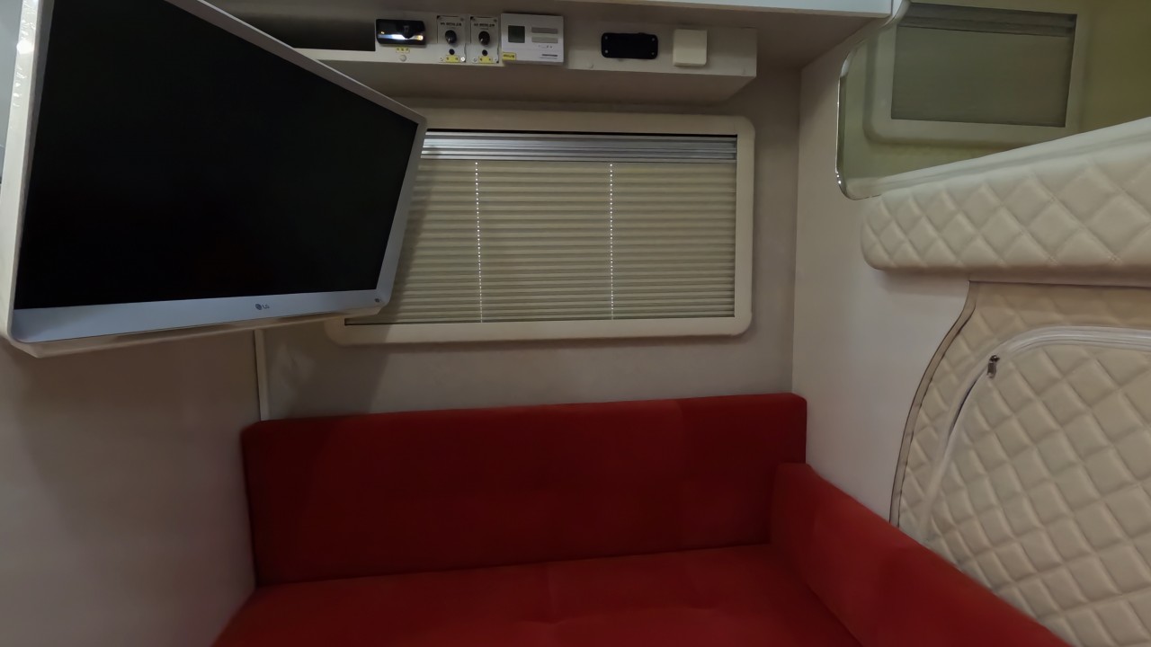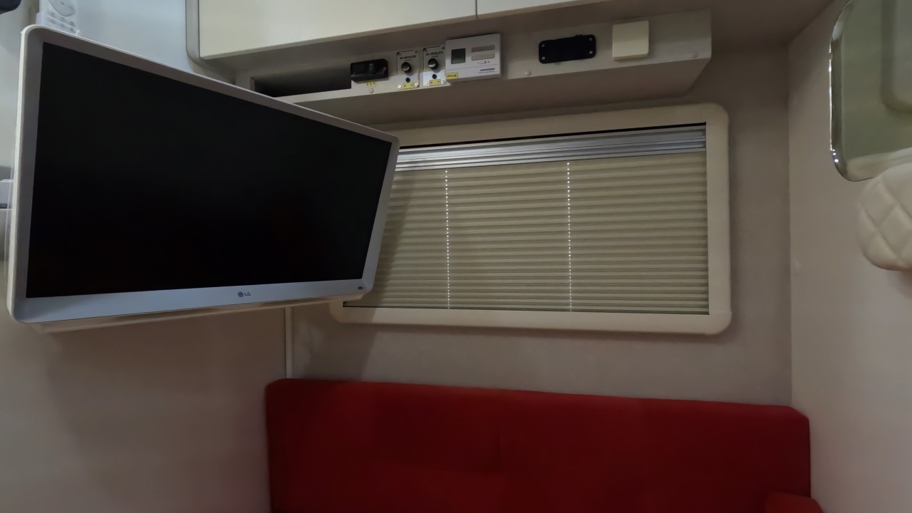 내부 : 벽걸이에어컨, 에바스D5(온수,히터,바닥난방), 온수매트, TV, 냉장고100L, 전자렌지, 개수대, 청수200L, 오수100L, 욕실, 고정식변기, 맥스팬