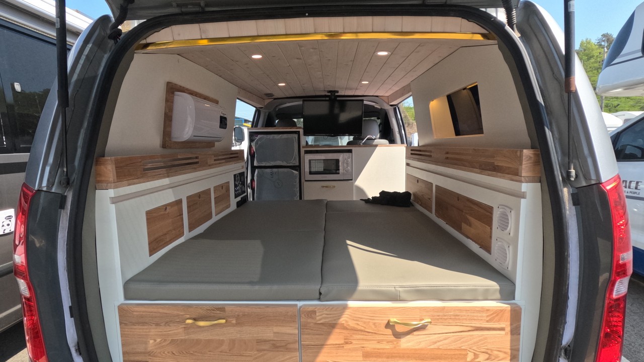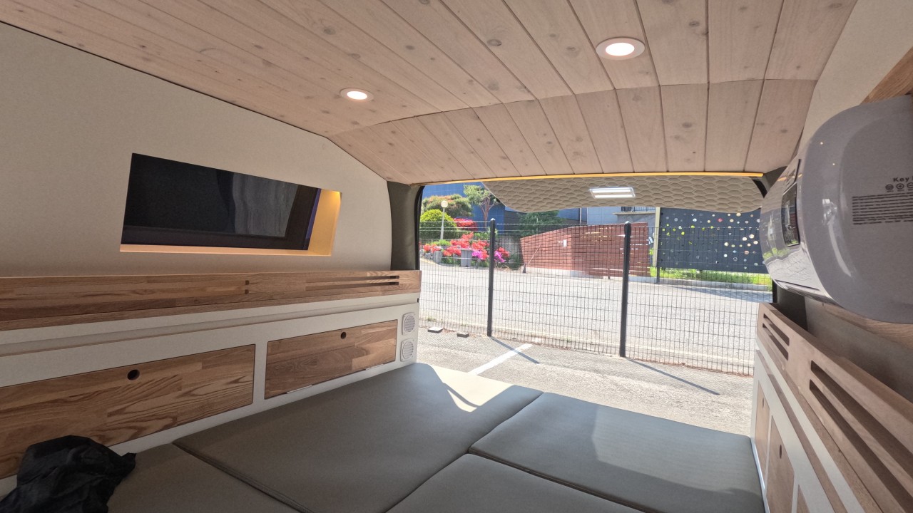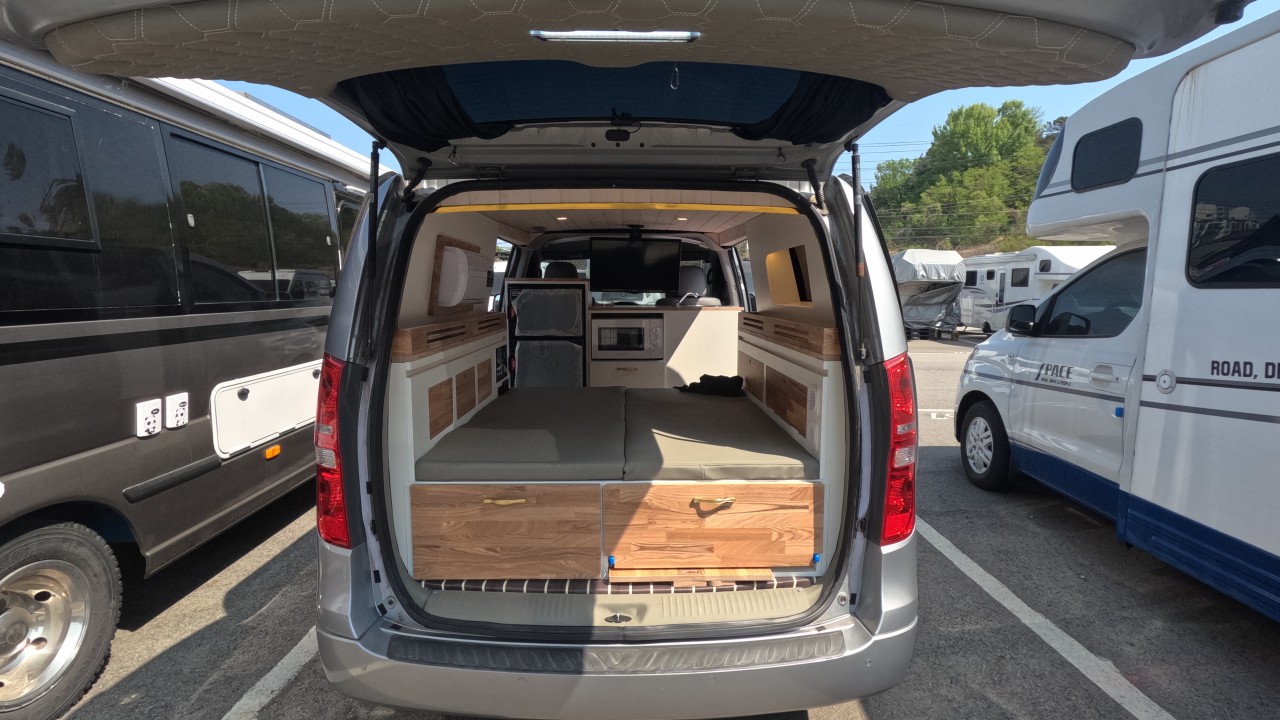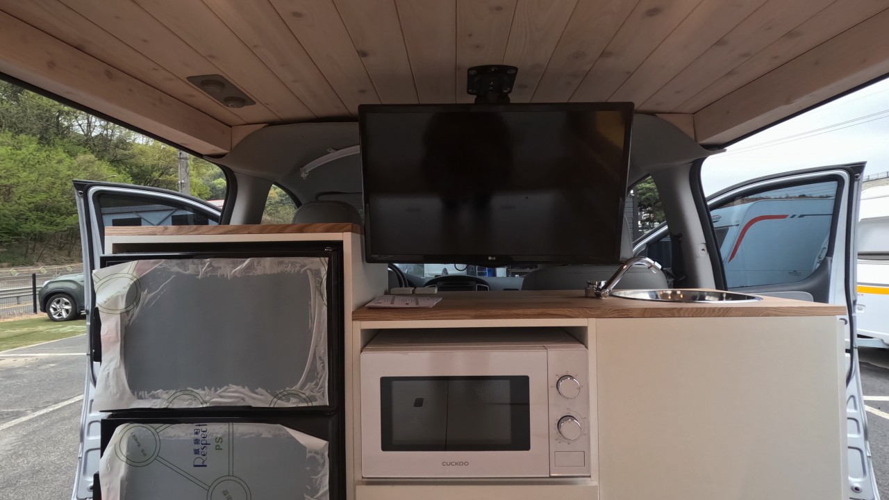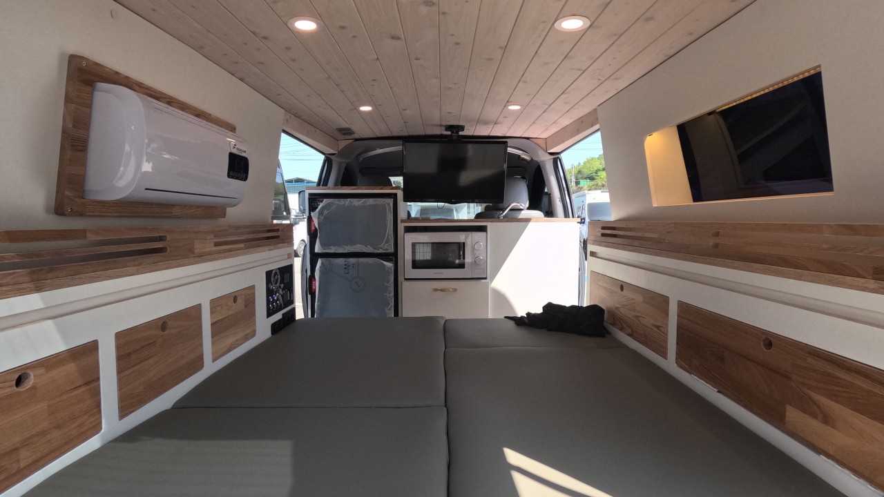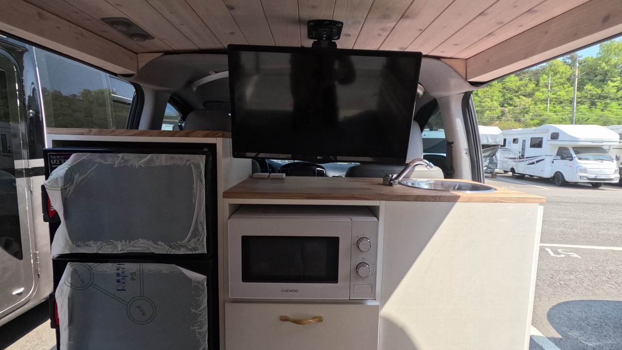 내부 : DC에어컨, 무시동히터, TV, 냉장고, 전자렌지, 개수대, 청수20L, 오수20L, 벽면수납장, 테이블