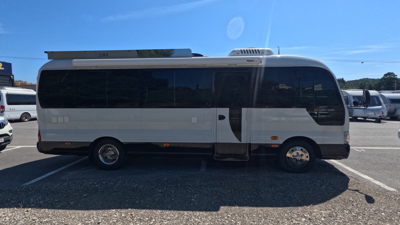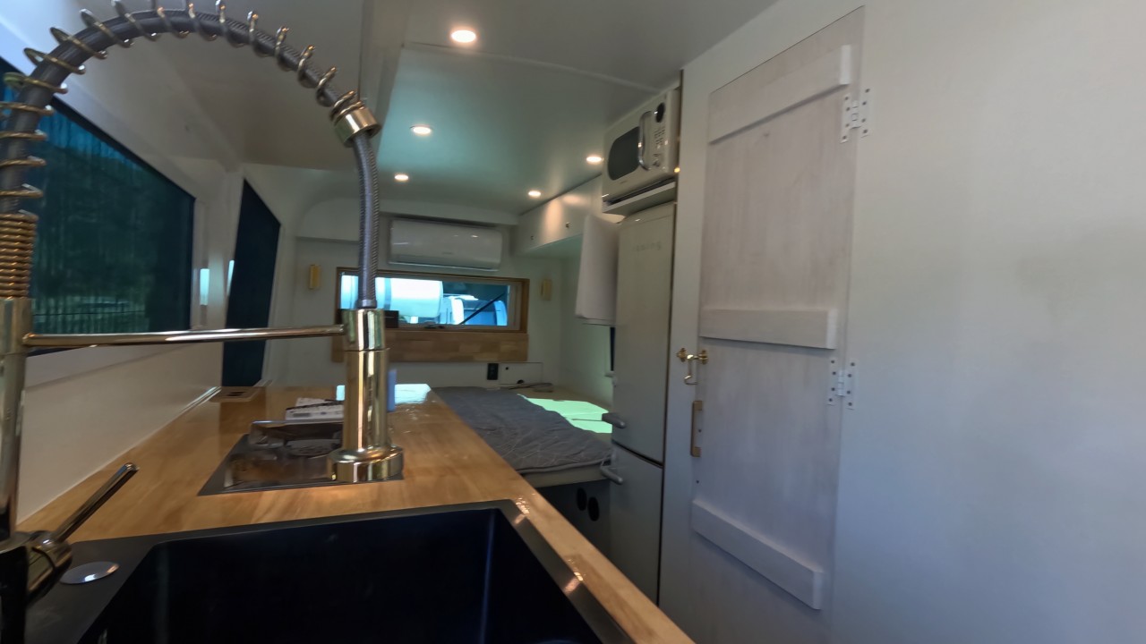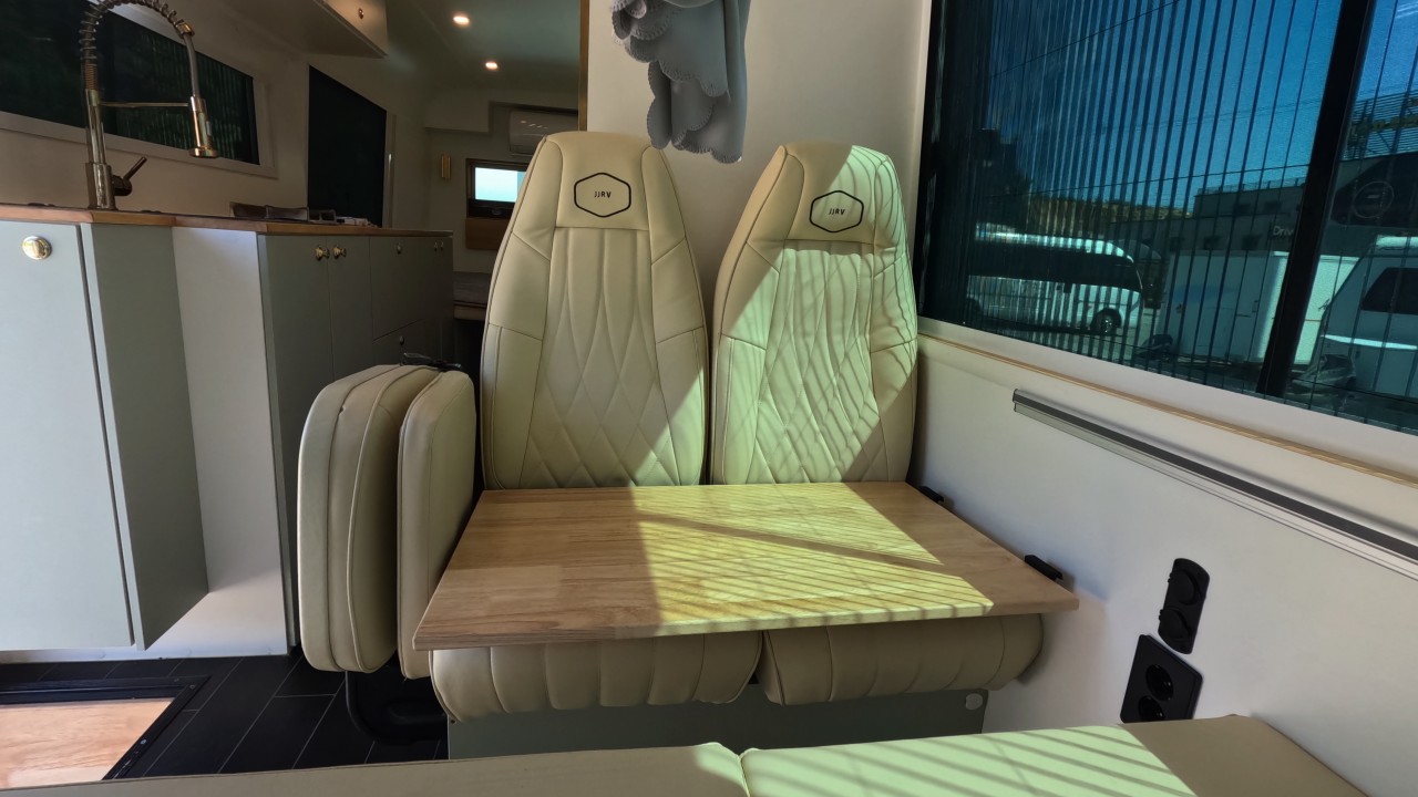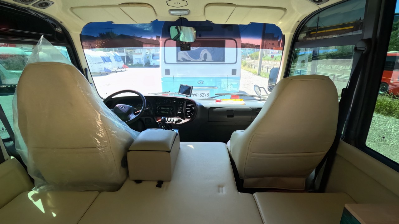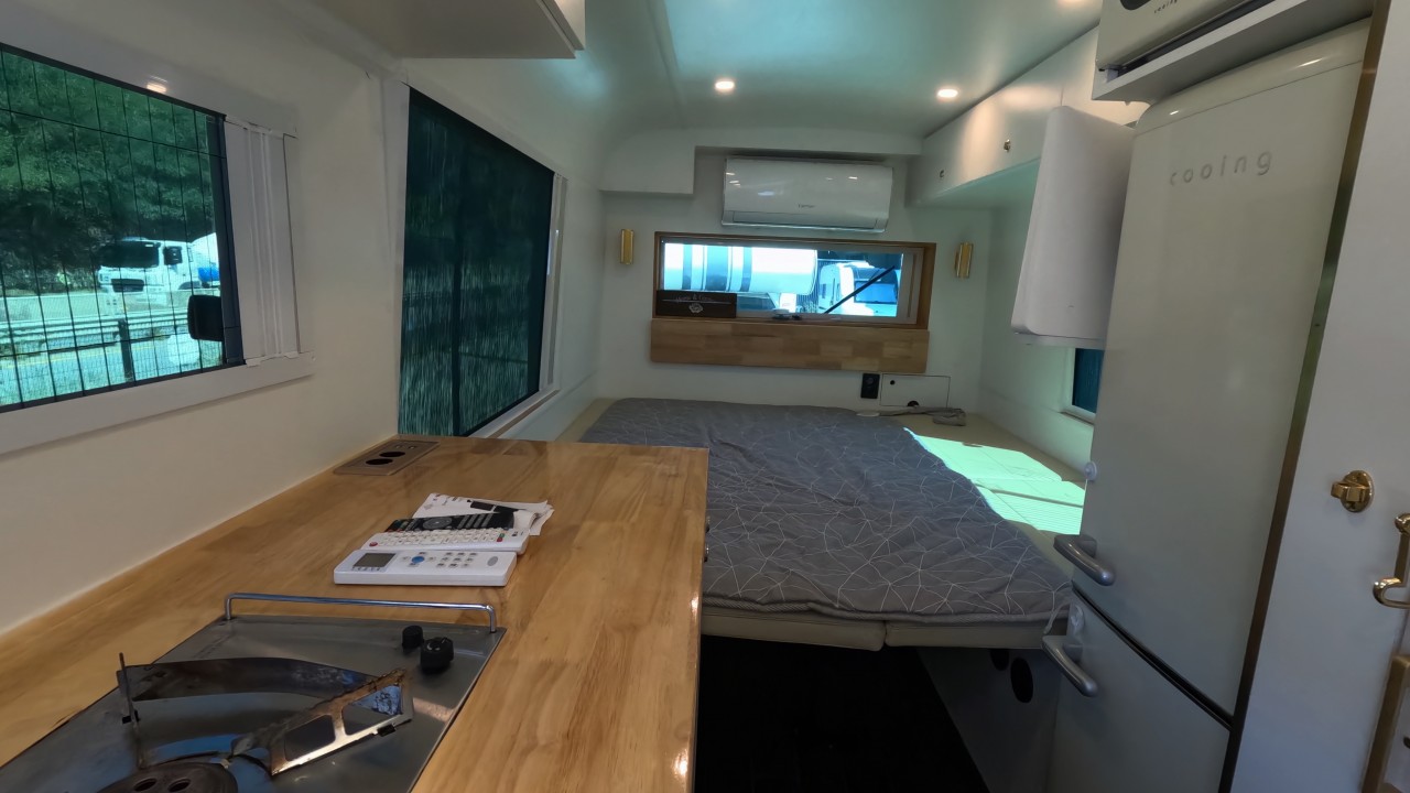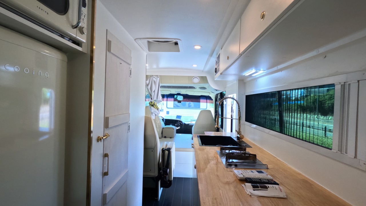 내부 : 베바스토EVO5, 온수, 온수매트, 맥스팬, 벽걸이에어컨, 개수대, 냉장고150L, 전자렌지, TV, 욕실, 고정식변기, 청수250L, 오수150L