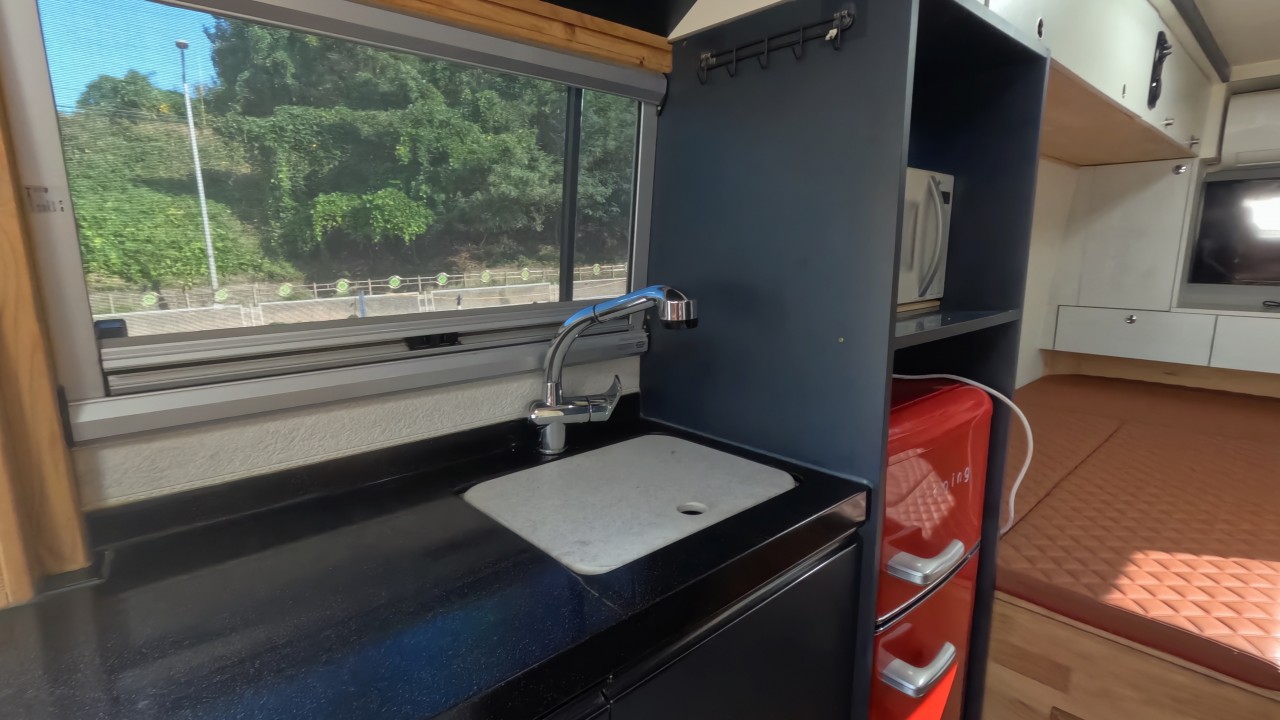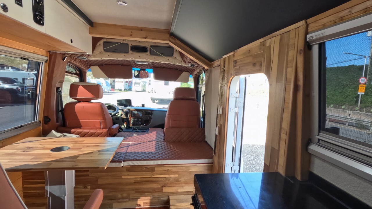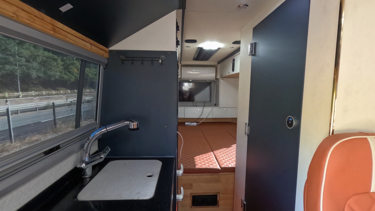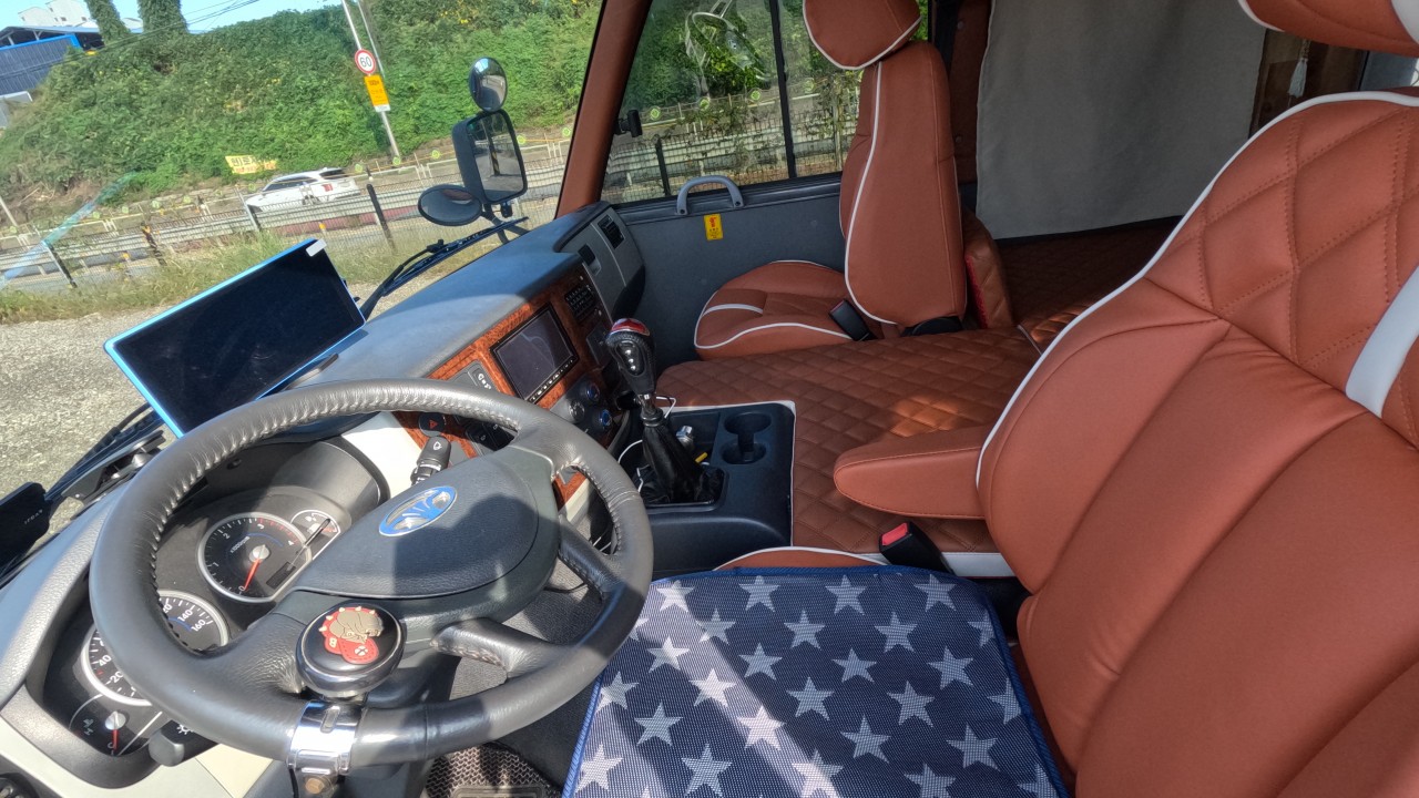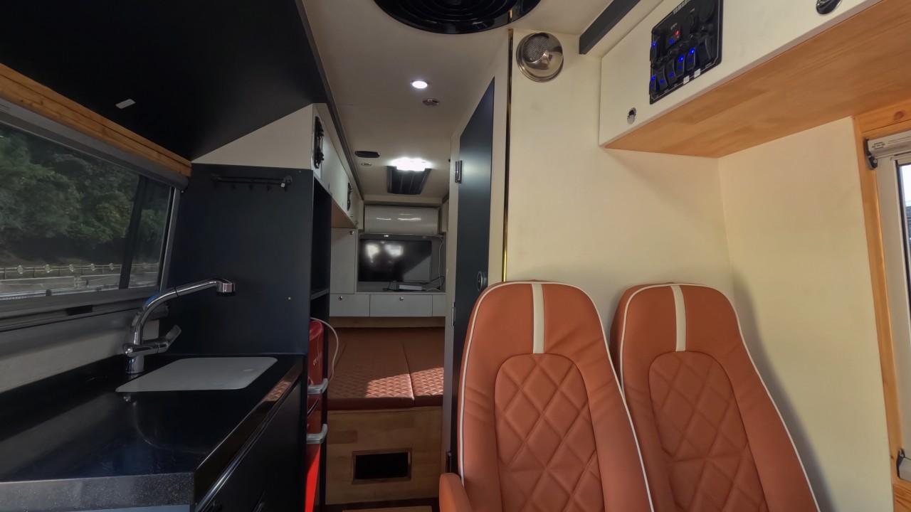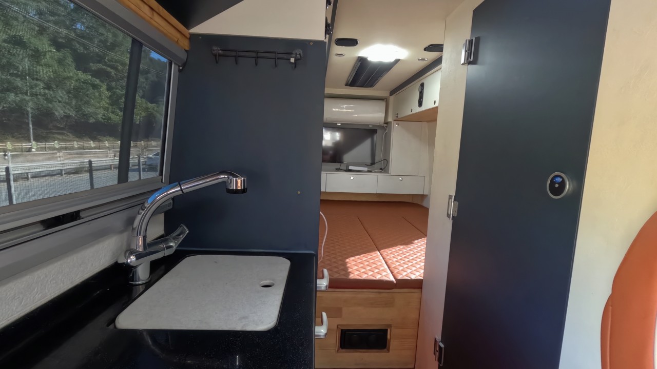내부 : 벽걸이에어컨, 에바스D5, 온수, TV, 냉장고, 전자렌지, 개수대, 청수200L, 오수75L, 욕실