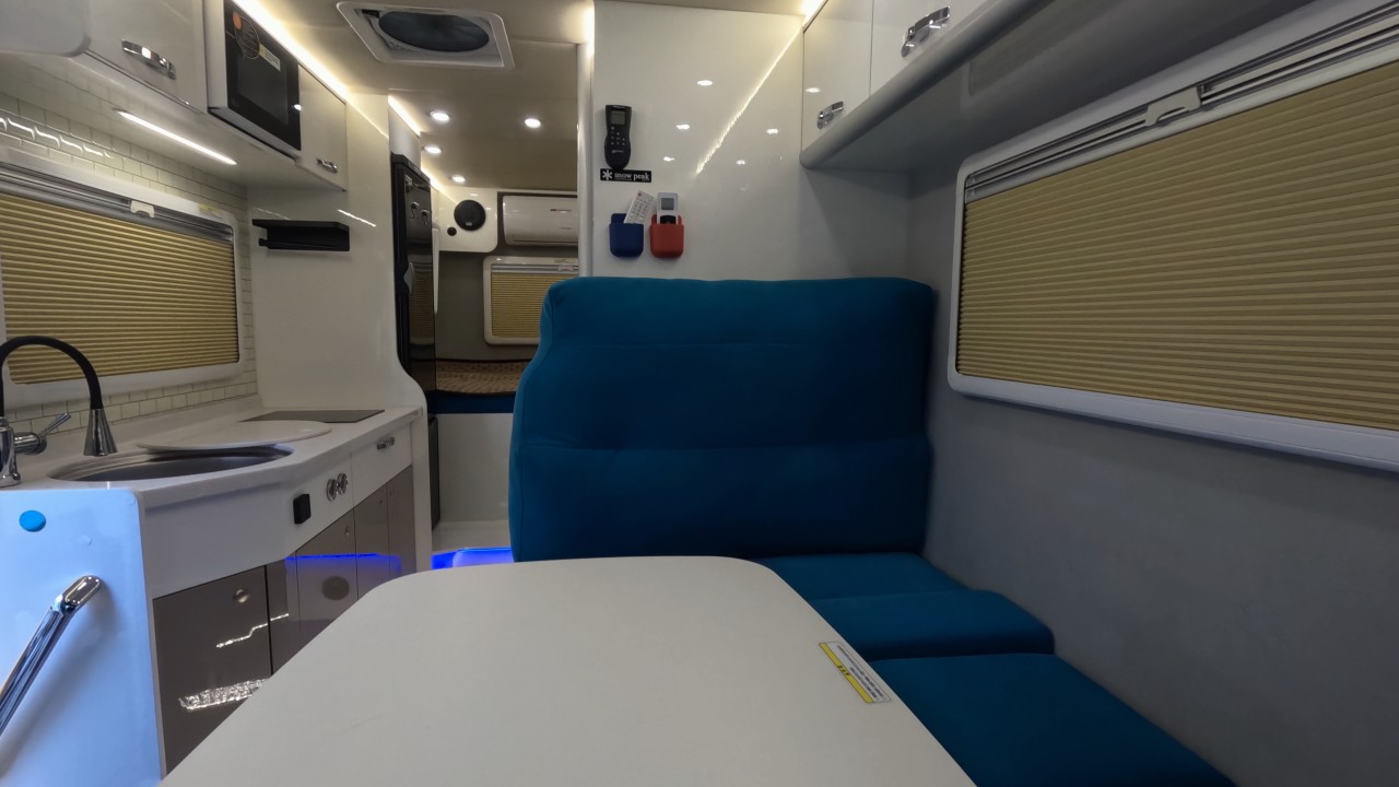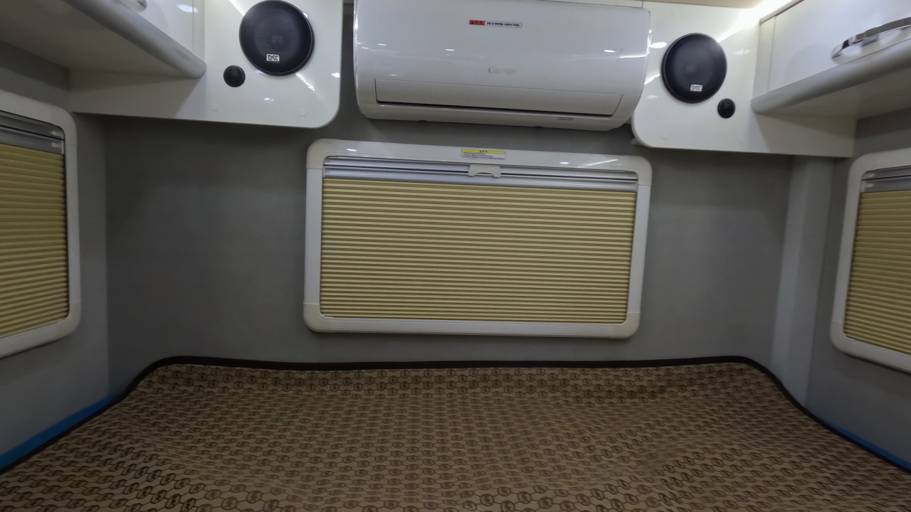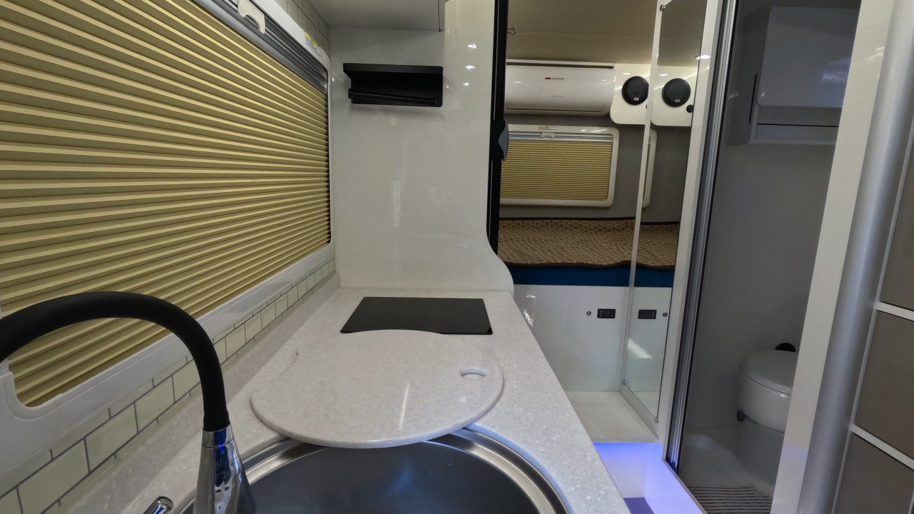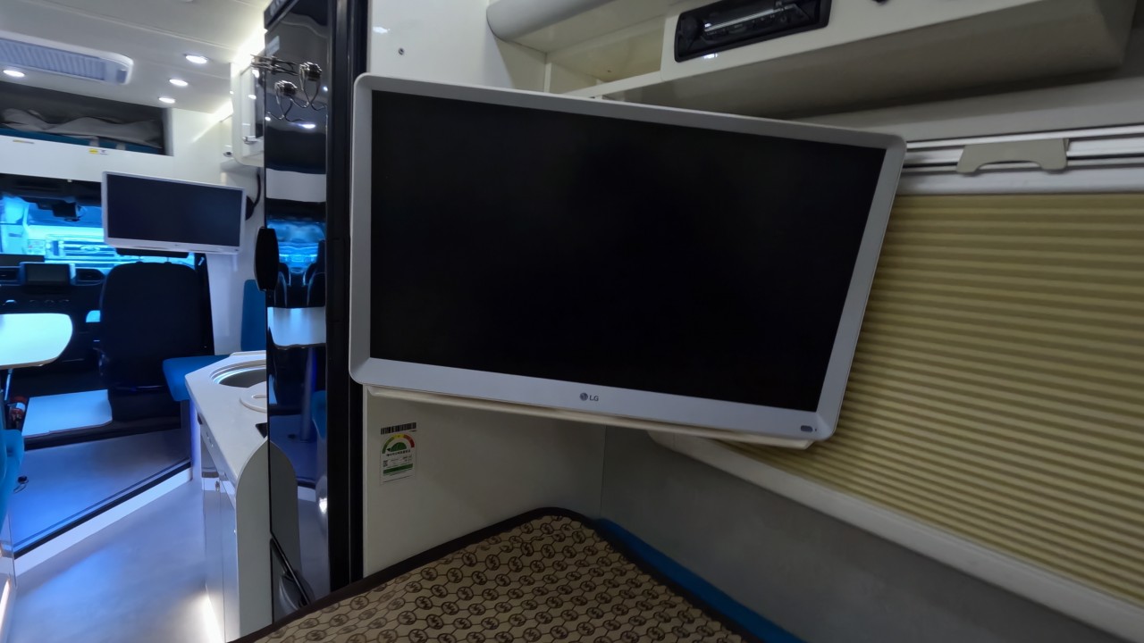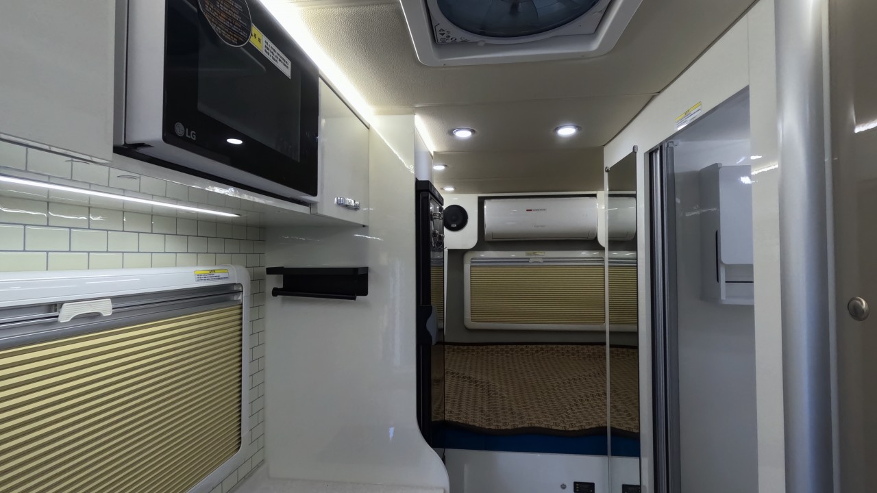 내부 : 벽걸이에어컨, 에바스D2, 에바스D5, 냉장고150L, 인덕션, 개수대, 청수150L, 오수50L, 욕실, 고정식변기, 맥스팬, TV
