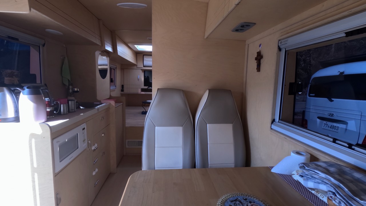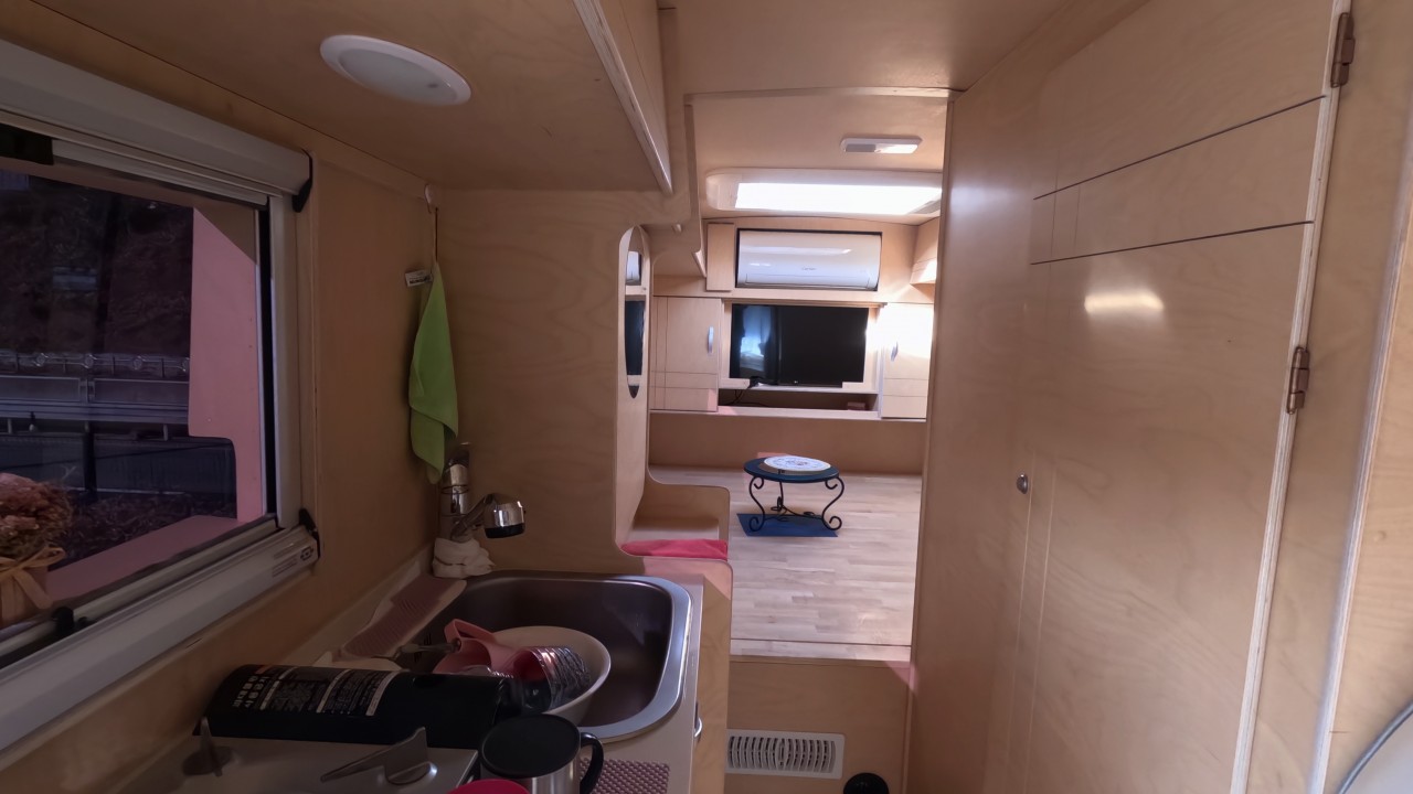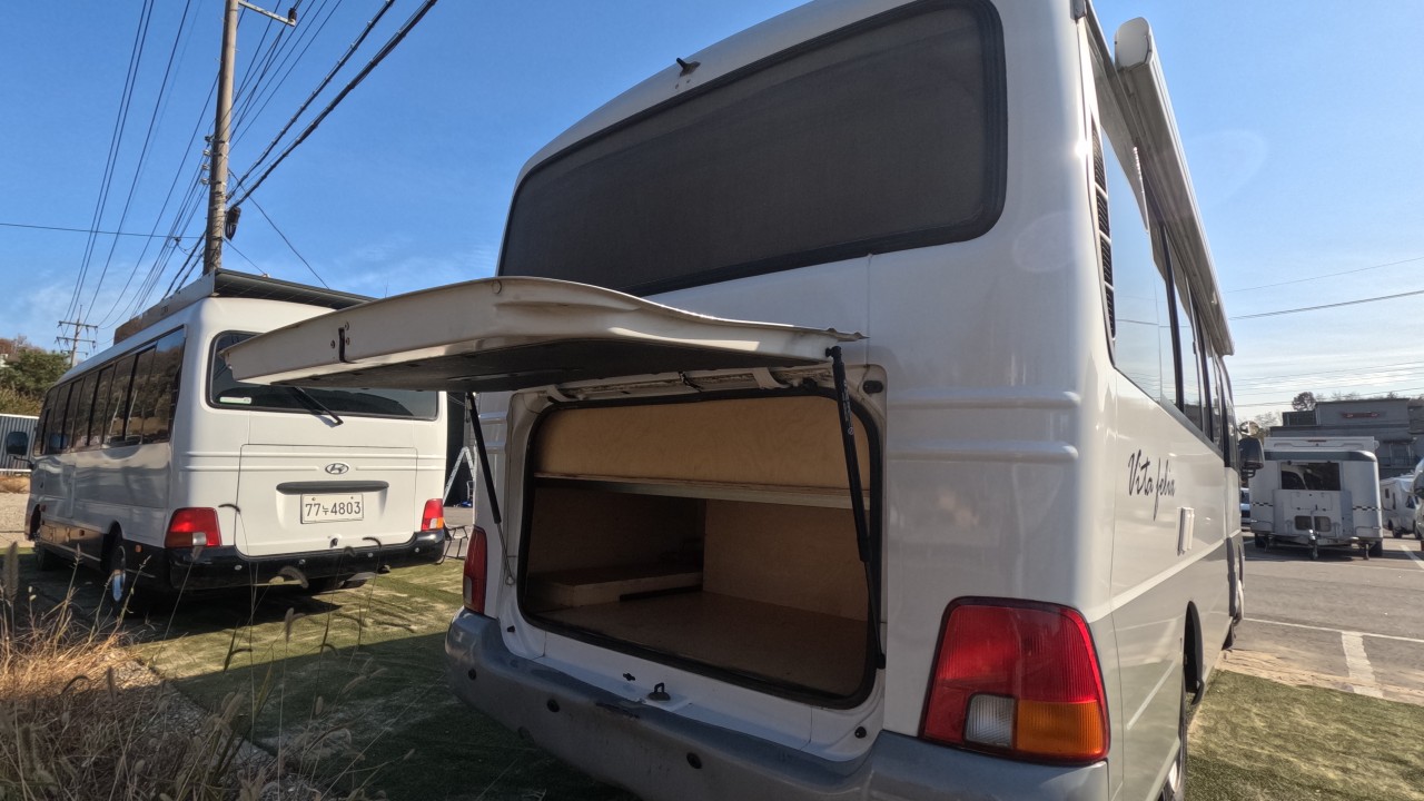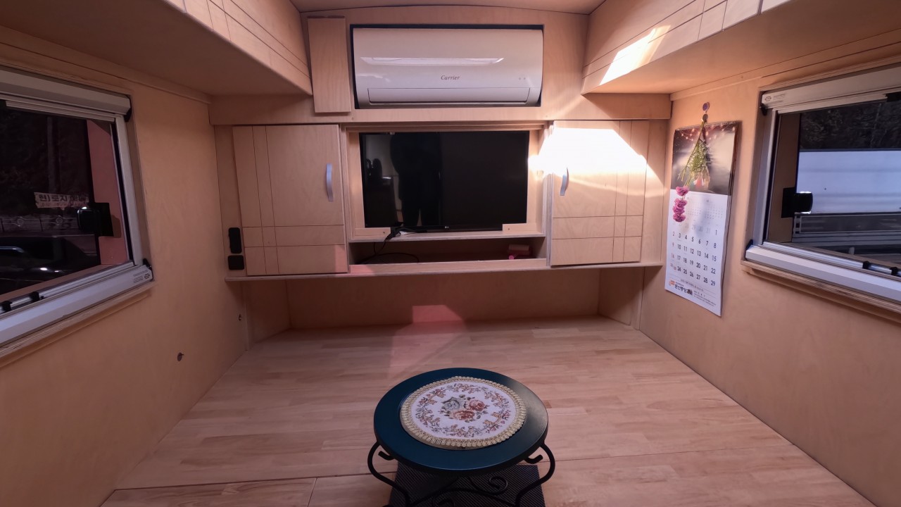 내부 : 벽걸이에어컨, 에바스D2, 온수, TV, 냉장고, 전자렌지, 개수대, 청수150L, 오수100L, 욕실, 고정식변기, 맥스팬, 해키창, 자작나무