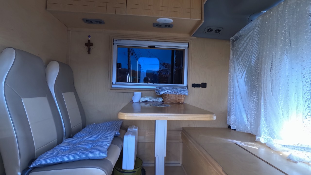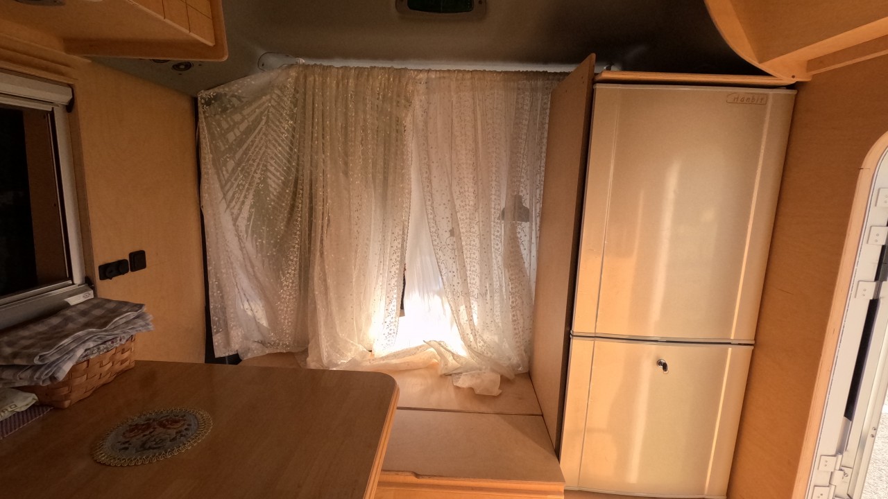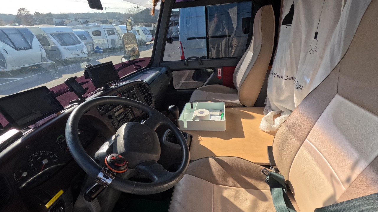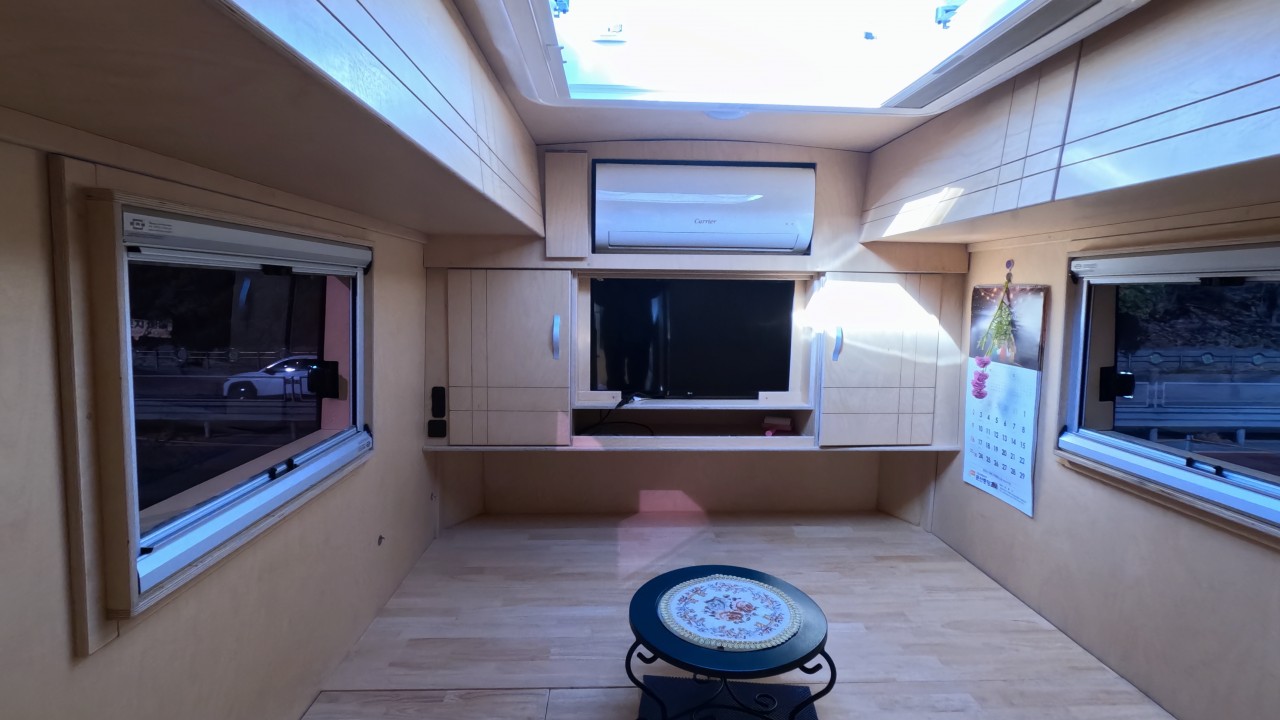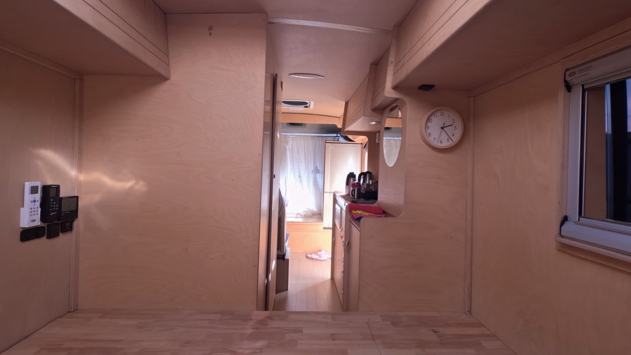 내부 : 벽걸이에어컨, 에바스D2, 온수, TV, 냉장고, 전자렌지, 개수대, 청수150L, 오수100L, 욕실, 고정식변기, 맥스팬, 해키창, 자작나무