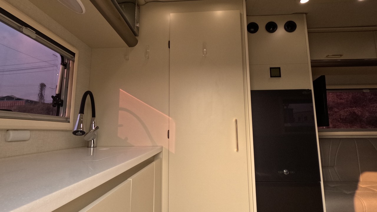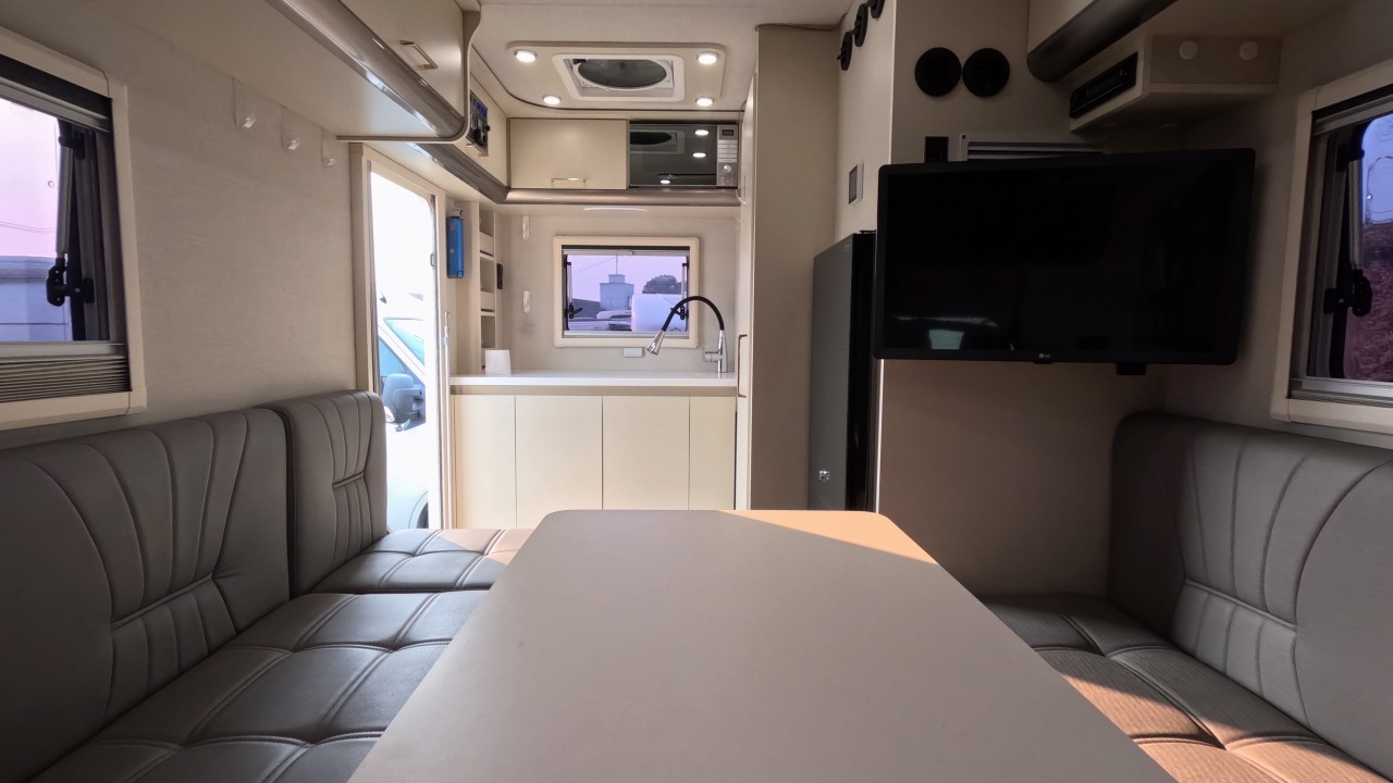 내부 : 에바스D5 온수난방보일러, 온수매트, 맥스팬, 벽면형에어컨, TV, 냉장고150L, 전자렌지, 개수, 청수200L, 오수100L, 고정식변기(SOG)