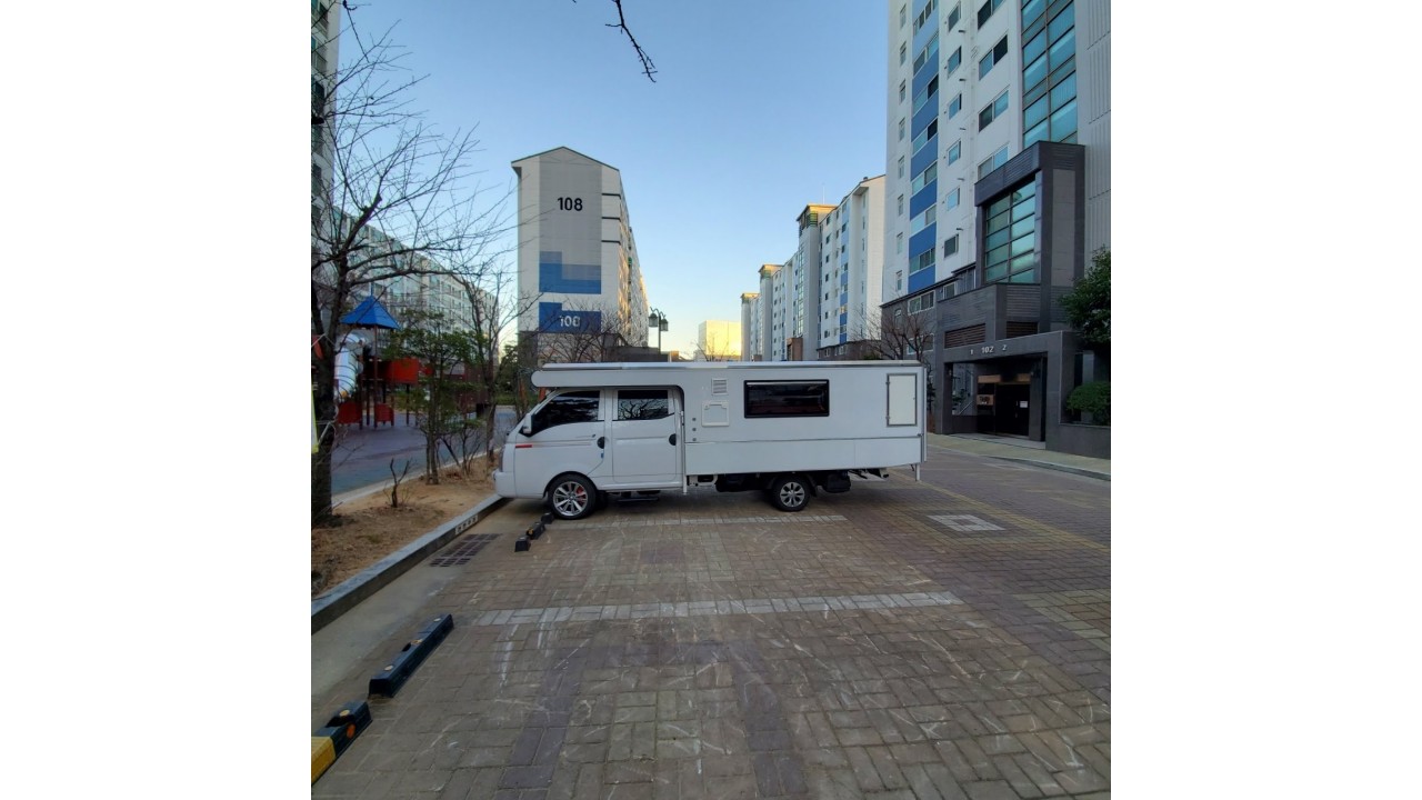 이 캠핑카의 가장 큰 장점은 지하주차장에 주차가 가능하다는 점입니다. 높이가 2.1m라서 보통 지하주차장이 2.3m또는 2.4m 제한 이라 주차 스트레스가 없습니다. 다만 길이가 거의 6m에 가까워서 튀어나오는건 어쩔수가 없네요. (사진 참고)이정도 튀어나온다고 보시면 됩니다.