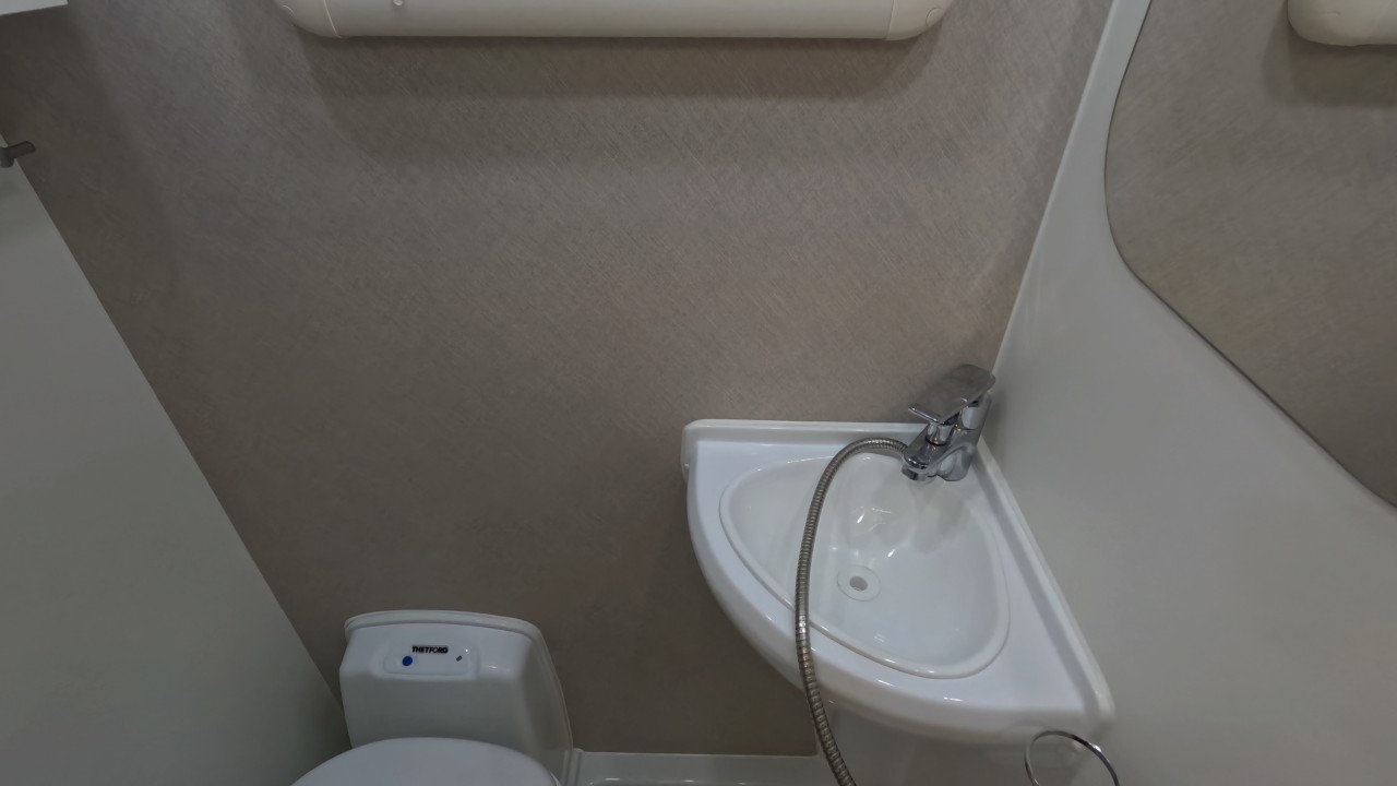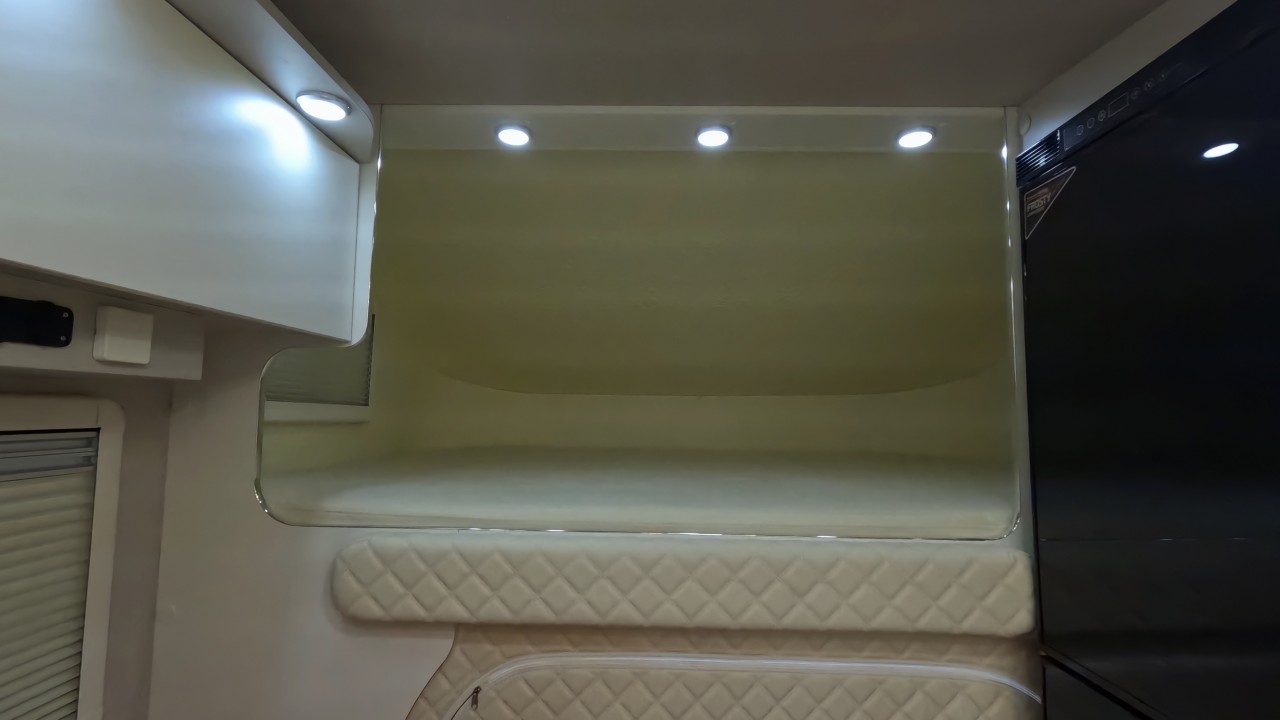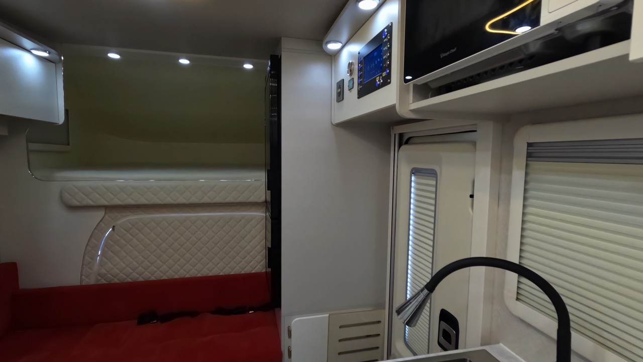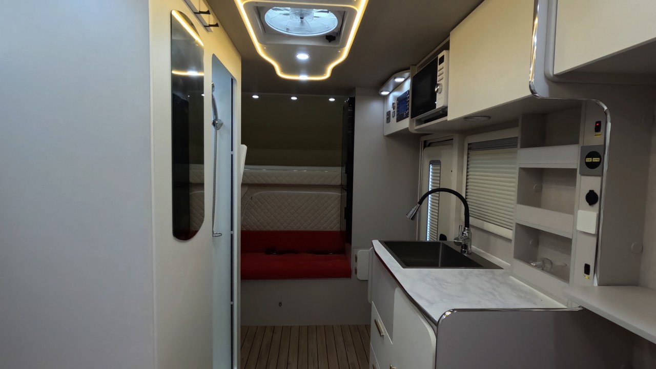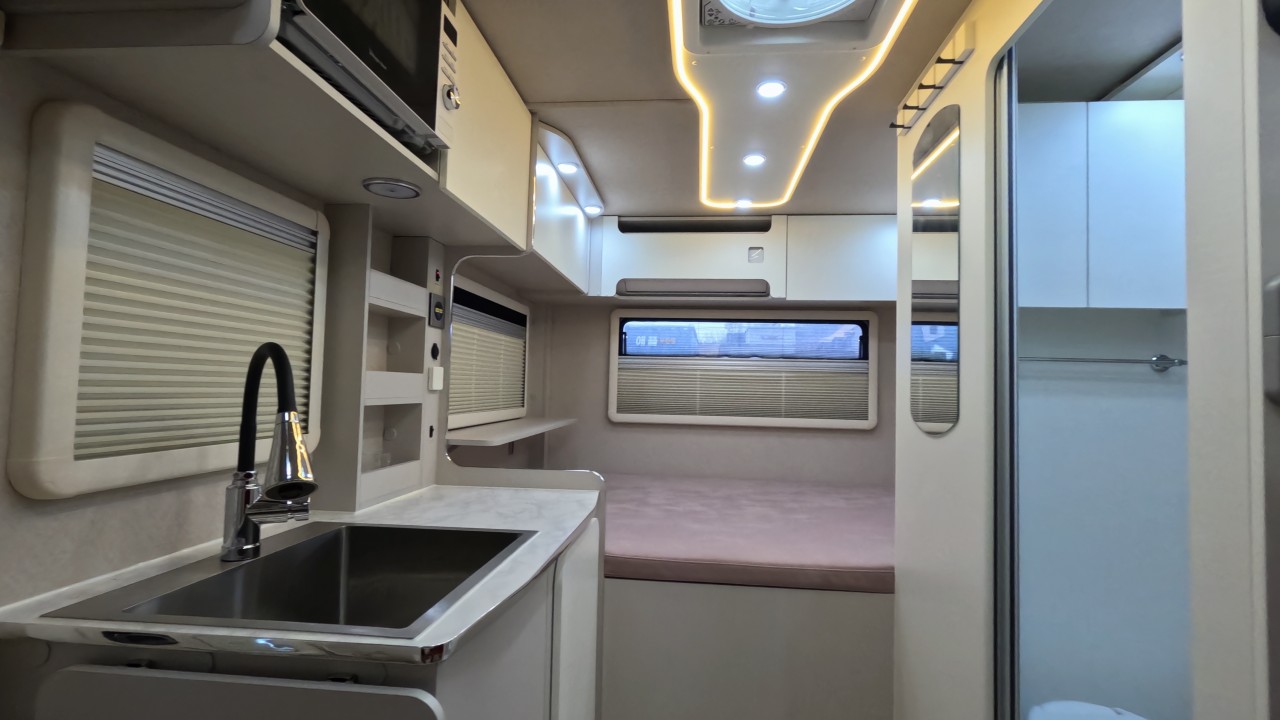 내부 : 벽걸이에어컨, 에바스D5(온수,히터,바닥난방), 온수매트, TV, 냉장고100L, 전자렌지, 개수대, 청수200L, 오수100L, 욕실, 고정식변기, 맥스팬