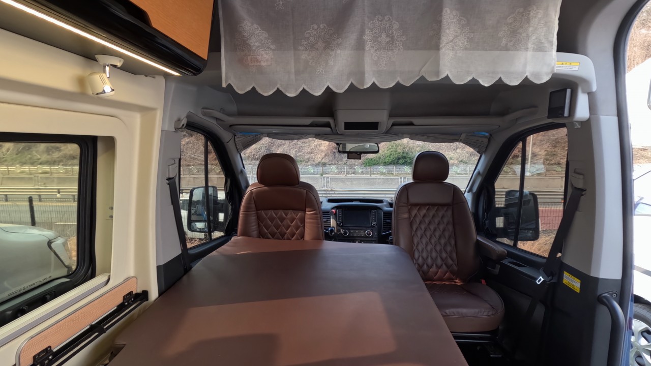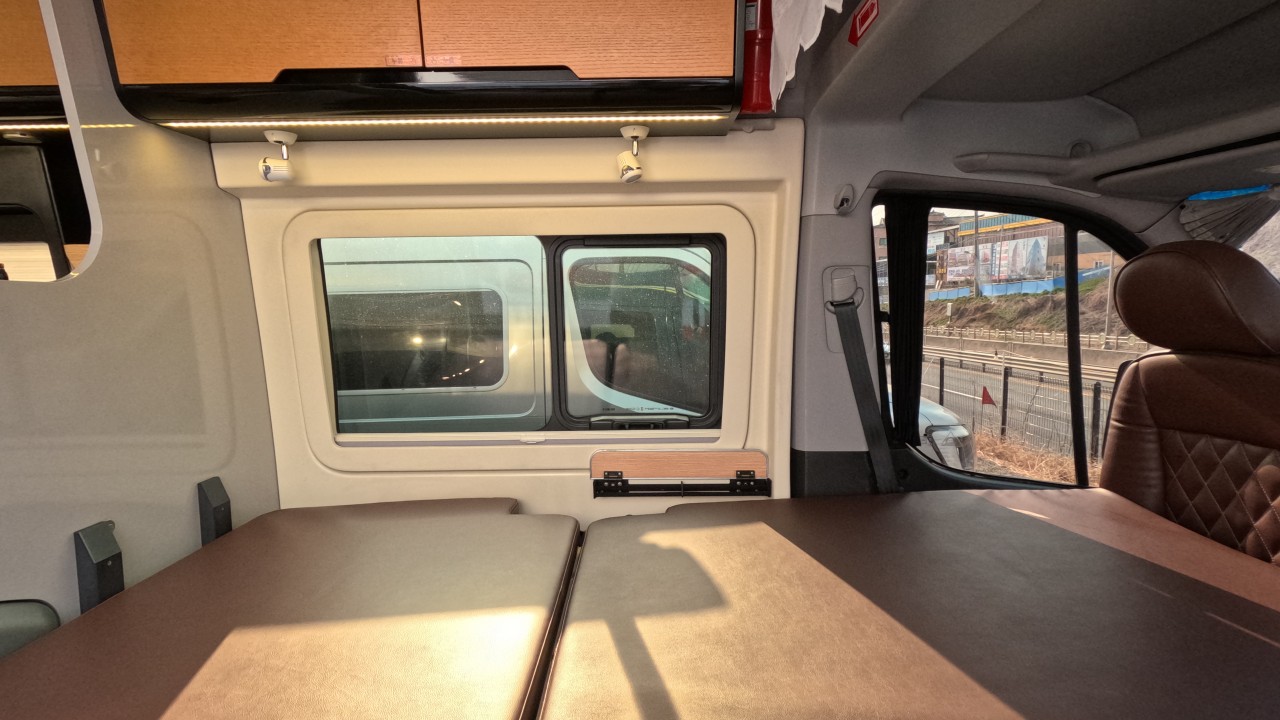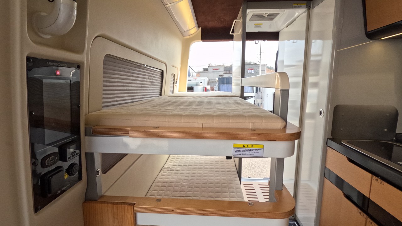 내부 : 천장형에어컨, 에바스D2, 냉장고, 2구가스렌지, 개수대, 청수76L, 오수95L, 욕실, 고정식변기, 환기팬, 2층침대, 1열/2열회전시트