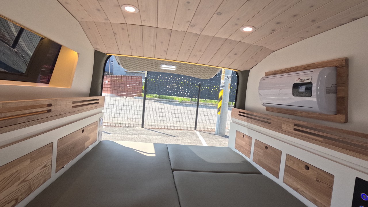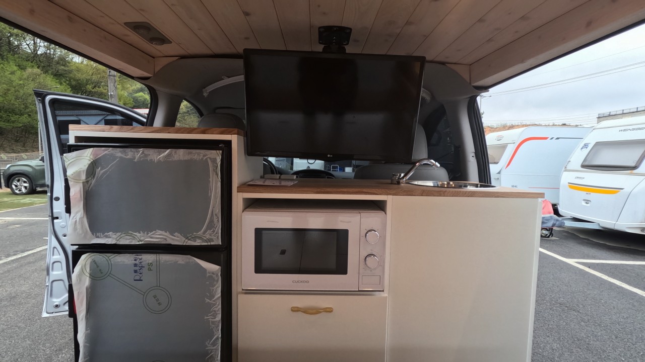 내부 : DC에어컨, 무시동히터, TV, 냉장고, 전자렌지, 개수대, 청수20L, 오수20L, 벽면수납장, 테이블
