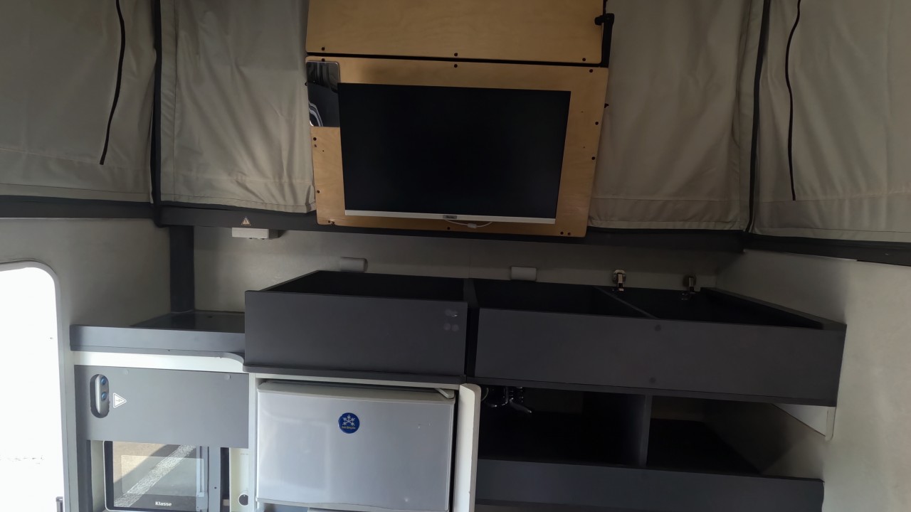 내부 : 무시동히터5K, TV, 셋톱박스, 냉장고90L, 전자렌지, 창문형에어컨, 개수대, 청수100L, 오수100L